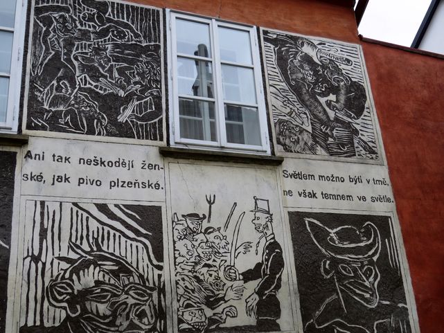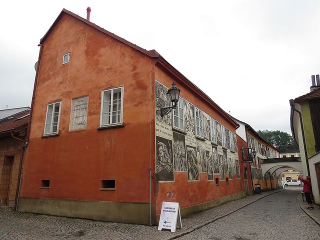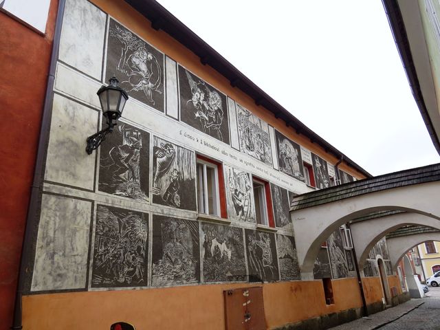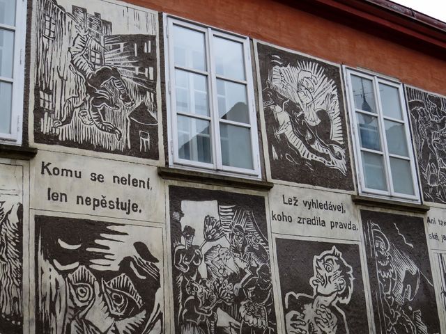 Než opustíme město, prohlédněme si Váchalovu uličku s černobílými sgrafity, která jsou replikami dřevorytů z Krvavého románu Josefa Váchala (1884–1969). Ulička vede ze Smetanova náměstí na zámecké návrší a v roce 1998 ji sgrafity vyzdobili absolventi restaurátorské školy v Litomyšli.