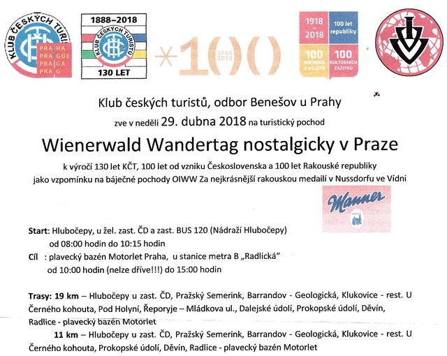 KČT, odbor Benešov u Prahy pořádal turistický pochod k výročí 130 let Klubu českých turistů, 100 let od vzniku Československa a 100 let Rakouské republiky jako vzpomínku na báječné pochody OIWW Za nejkrásnější rakouskou medailí v Nußdorfu ve Vídni