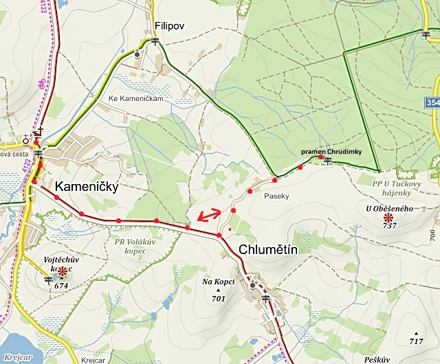 Stoupání silnicí ke Chlumětínu zdaleka nebylo nezáživné – jako vzácná bílá perla s tmavým zdobením nás přitahoval vpravo usazený Volákův kopec nad Kameničkami, který by bez Antonína Slavíčka zůstal jen neznámým pahorkem porostlým lesem.
