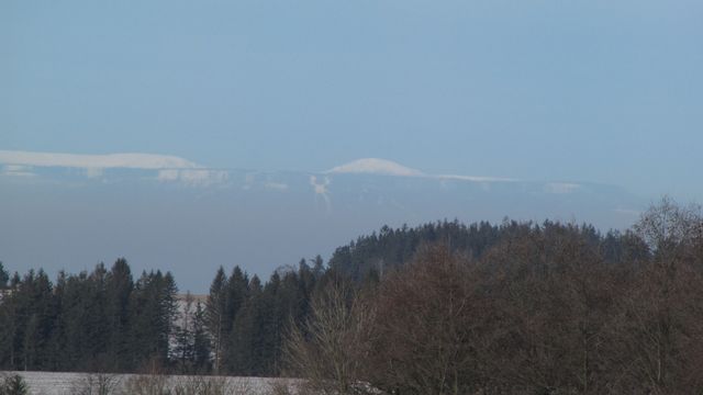 Zmínila jsem, že kolem poledne se dalo do práce slunko – bylo tak snaživé, že dokonce vymetlo celou oblohu, takže výhledy byly, bez přehánění, úchvatné! Dokladem je následující obrázek krkonošského hřebene:
