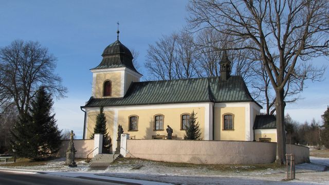 Naproti kostelu, na druhé straně parčíku, je Galerie Antonína Slavíčka, v jejímž průčelí jsou umístěny bysty obou výše jmenovaných umělců a jejich pamětní desky na protější škole.