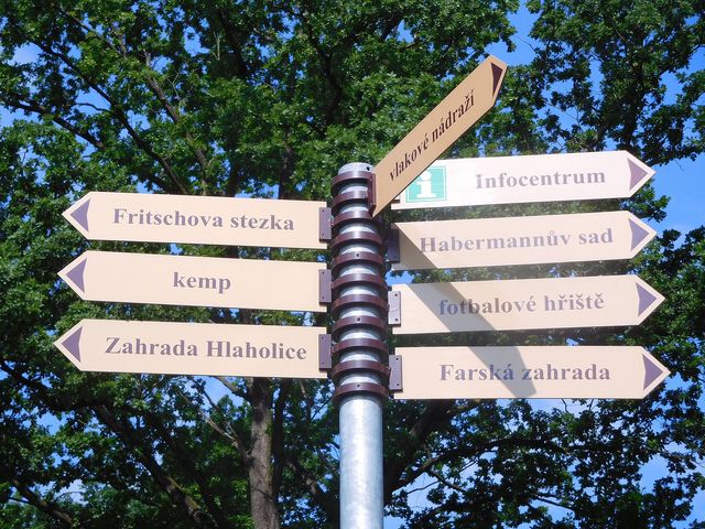 Zahrada byla na místě černé skládky dokončena v roce 2017, vévodí jí netypické mohutné trůny s nápisy v hlaholici, po celém parku jsou, většinou zabudované v trávníku, betonové desky, na nichž najdete písmena hlaholice a dnešní ekvivalenty, takže si návštěvník může převést do prastarého slovanského písma třeba svoje jméno (i když zub času podporován počasím neúnavně opracovává obě verze). 🙂