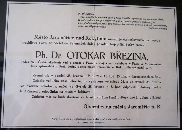 V roce 2010 byly na výstavě věnované Otokaru Březinovi k vidění výstřižky z novin s textem  Karla Čapka nazvaným Několik zastávek. Z Mirkovy fotografie zařazuji opis části Čapkova textu o Otokaru Březinovi, který už tehdy žil a učil v Jaroměřicích nad Rokytnou: