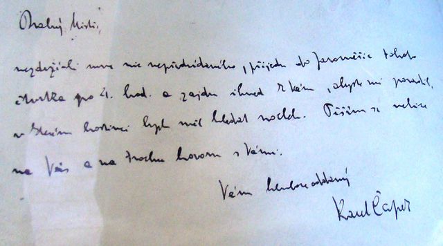 Jen kdybyste zde byli Vy a Otcovi a všichni ti milí, na které oddaně vzpomínám. Ty naše večery, které byly pro mne svátkem, chvíle radostných improvizací, cesty vegetacemi umělecké myšlenky, hra v letu zachycovaných pohledů v život, důvěrný, otevřený hovor, jak je ho potřeba duši člověka – a všechno v atmosféře Vašich sympatií a Vaší laskavosti.