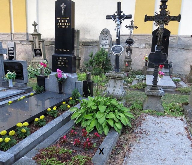 Text na kříži: Zde v Pánu odpočívají Ignác Jebavý, měšťan Počátecký, †26. 2. 1890 stár 74 roků a manželka Kateřina † 22. 2. 1890 stáří 59 roků.