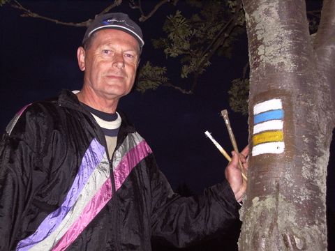 Na rozcestí u Dobré Vody ke směrovníku, kde byl konec naší dnešní práce, jsme došli už za tmy. Celá označená trasa měla jen 5 km, ale dala nám pořádně zabrat! Byli jsme ale moc šťastní, že jsme udělali něco prospěšného. Nejsme blázni? Podle GPS, kterou jsme měli sebou, jsme ušli 14 km a práce trvala 10 hodin. Sedli jsme do auta a asi za čtvrt hodiny začalo pršet – snad nám déšť nesmyje ty poslední značky, které třeba nestačily pořádně zaschnout?! Uvidíme, protože během měsíce musíme ještě pokračovat ve značení z Dobré Vody do Březky (přes Práskolesy). Přidávám poslední fotku, ze které je zřejmé, že ta poslední značka už byla malovaná za tmy. Tak prosím vás, až tou naší nově označenou cestou půjdete, vzpomeňte si, že jsme ji malovali v potu tváře a usilovně, ale rádi kvůli vám i sobě.