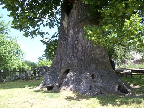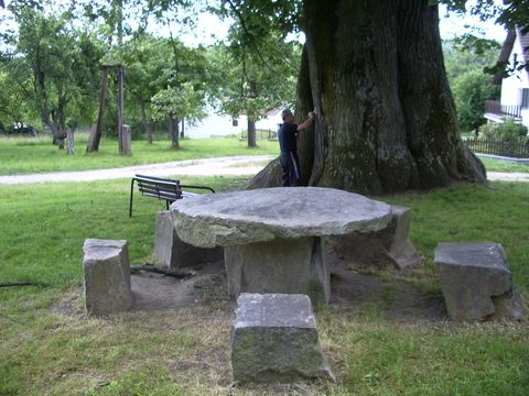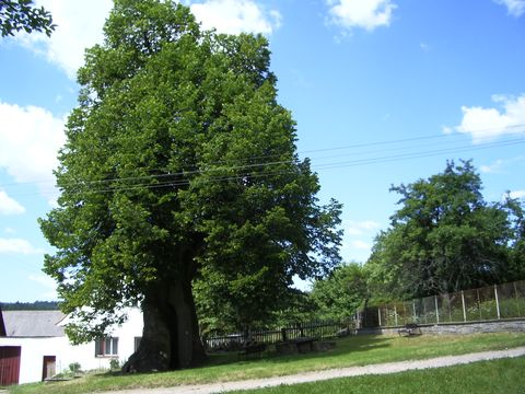 V pohodě jsme se proznačkovali až do Práskoles (nevím, zda je správně varianta s čárkou či bez, vyskytuje se obojí) a už nás vítaly památné lípy, jedna z nich je prý stará 300 let, ale my jsme měli oči jen pro tu nejstarší – prý asi 800 let, obvod kmene 920 cm. Opravdu při prvním setkání zůstáváme v úžasu stát před jejím majestátem… To bílé u paty lípy není hra světla, to je můj akční značkař.