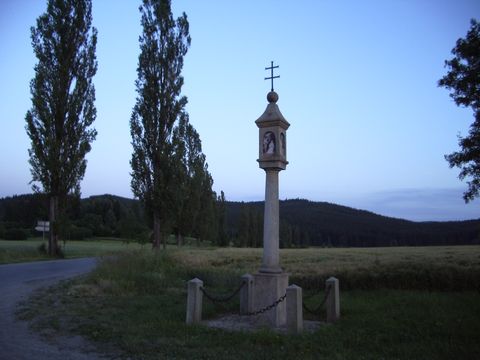 Při zpáteční cestě jsme u silniční odbočky do Práskoles uviděli kamenná Boží muka, která, myslím, vhodně dokreslují zdejší poetickou krajinu.
