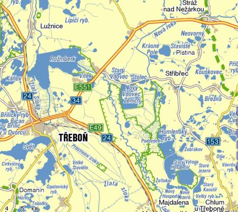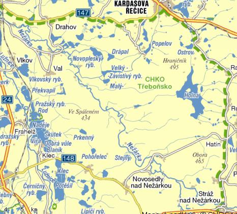 Kardašova Řečice – Cikar – Pecák+Dolní Vydýmač – zámek Jemčina – Bašta – Stříbřec – památník Emy Destinnové – dubová alej kolem Nové řeky – Novořecké močály – Starý Hospodář – Lutová – Starý a Nový Kanclíř – Kosky+rekreační areál – třeboňská cesta – Opatovický rybník+mlýn+hřebčín – Svět – Třeboň – Břilice+rybníky – Přeseka – Rožmberk – Lužnice – Klec – rybníky Víra+Naděje+atd. – Vlkov – Val – Hamr – Nítovice – Kardašova Řečice.