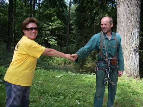 Práce mu šla od ruky jako když hraje, my jsme dole stáli s otevřenými ústy a najednou opravdu něco začalo hrát – panu Veverkovi zvonil mobil. V klidu pro něj sáhnul do náprsní kapsy, ohlásil se, pohovořil (to vše zavěšen na laně nejméně 20 metrů nad zemí) a pak pokračoval v práci. Pro mne to byl zlatý hřeb dnešního dne…Vím určitě, že na tohle nezapomenu – fakt to byl borec a navíc dělal moc užitečnou práci.