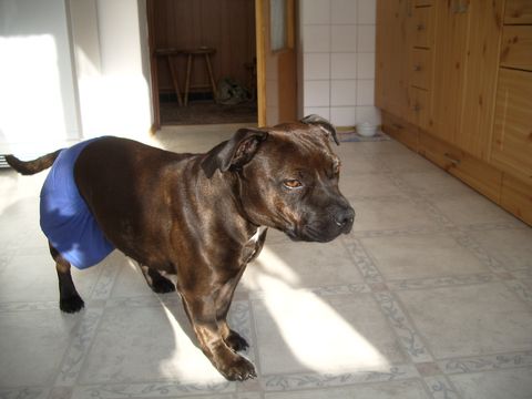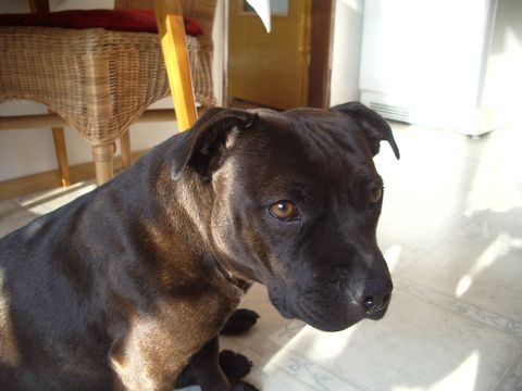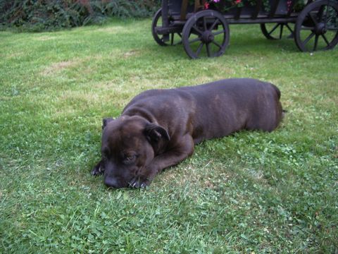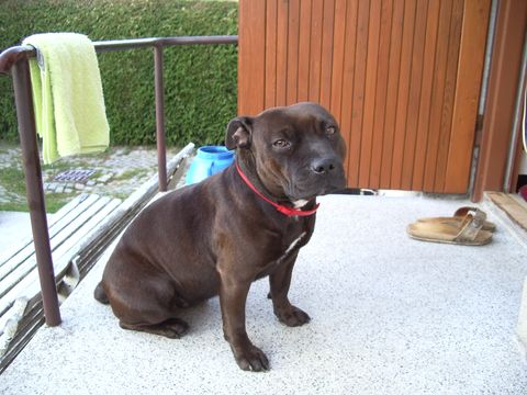Naopak fenka Indie je vždycky připravená vyhovět nám ve všem. Je to stafordširský bulteriér a tedy už založením je společenská, hodná a přátelská. Někdo říká, že tihle psi jsou tak škaredí, až jsou krásní. Poté, co jsme ji víc poznali, tvrdím, že pro její povahu jsme se do ní zamilovali a tedy ji považujeme za nádhernou. Pravda je, že kvůli ní máme poslední měsíce domácí vězení, protože dřív jsme mohli jet třeba na oba víkendové dny pryč, což teď nemůžeme…Za všechno se platí…Za pár dní bude pryč a mně bude smutno i po těch hovínkách, které ztrácela na zahradě a já je musela uklízet.