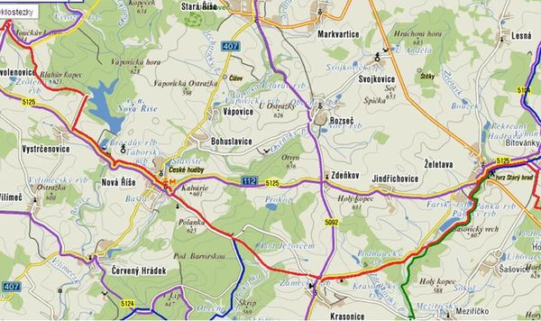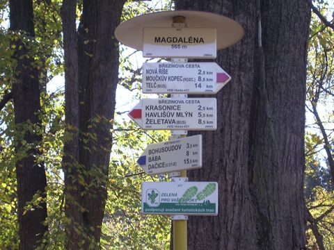 Z Želetavy až k Havlišovu mlýnu vede červená TZ společně se zelenou, ta se za mlýnem odděluje a vede do Jemnice, my jsme zůstali na Březinově cestě a krásné nedělní poledne jsme trávili pochodem do Nové Říše. Připadá mi fádní pořád dokola psát, jak je ta Vysočina krásná, ale nedá se nic dělat – je. Asi půl kilometru před Krasonicemi je kopec Humberk (na mapách označený jako sv. Hubert), na kterém je kaple Narození Panny Marie.