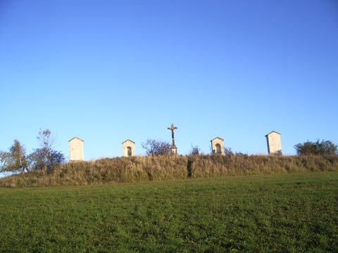 Autobus nám jel zpět v 18 hodin, a tak nám po návratu do Nové Říše zbývala ještě hodinka, kterou jsme někteří využili k výstupu na Kalvárii, o které jsem se dříve zmínila. Pohled z vrchu do kraje stál za to, jen ten kouř, který se valil z komínů vesnických domků a visel nad kotlinou trochu kazil náladu… To, co vidíme na obrázku, patřívalo k majestátní křížové cestě.