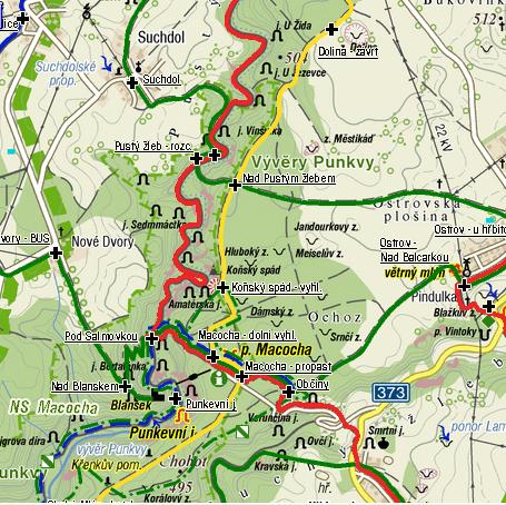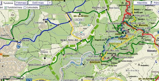 Druhý den jsme pro velký úspěch zvolili trasu do stejné oblasti, ale jinými cestami, jen čučnutí do Macochy bylo opětovné. Po zelené TZ jsme vyšli z Blanska do Těchova, tam jsme sestoupili ke Skalnímu Mlýnu, kde byla kontrola (tedy vlídné přijetí, razítka do vandrbuchu, horký dobrý čaj a pišingr), pak k Punkevním jeskyním (s odporem se vyhnout lanovce) a po červené vzhůru na Macochu, stejnou cestou dolů zpět a znovu vzhůru na protější svah kolem zříceniny hradu Blansek přes Nové Dvory do Obůrky a po modré TZ zpět do Blanska. Říkali, že to bylo 20 km, no nevím, ten údaj byl asi kvůli snadnému zapamatování při výběru z mnoha tras. V pět hodin jsme už zase byli zpátky, najíst a hurá na tancovačku – vše s patřičným nadšením. Tady je mapka sobotní trasy: