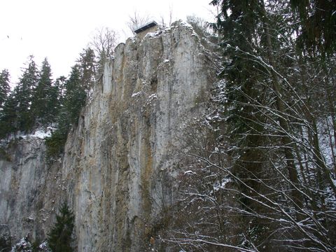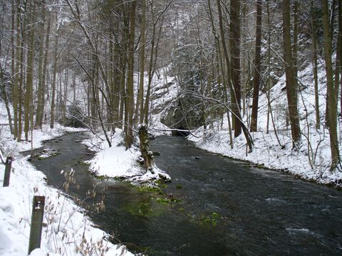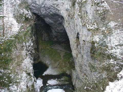 Na trasu jsme se vydali před jedenáctou hodinou, poté co jsme v jedovnickém kostele prožili tiché drama, které popisuji jinde. Počasí bylo mírně mrazivé, chvílemi poletoval sníh, jednu chvíli si dokonce sluníčko vydobylo svoji čtvrthodinku vítězství. Šli jsme silničkou v Pustém žlebu proti proudu Punkvy. První obrázek, který vám nabídnu, je tzv. Malý výtok, což prý není jen vyvěračka Punkvy, ale i potoků, které odvodňují Vilémovickou plošinu. Zajímavé na tom je, že doba průtoku je asi 1 měsíc!