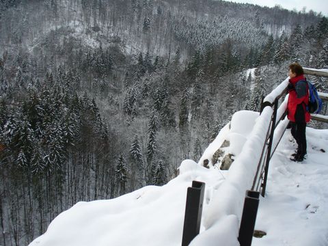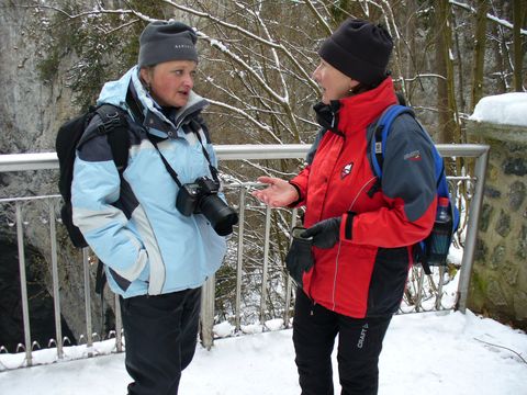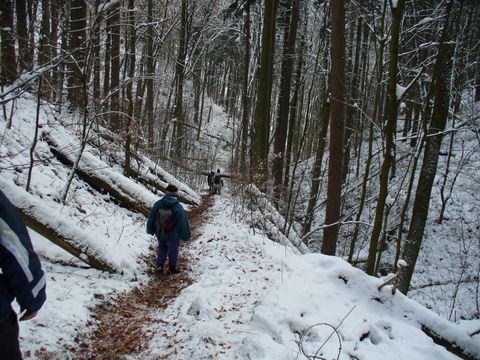 Vidíte, že bylo docela dost sněhu, asi 2 stupně pod nulou, sníh na povrchu umrzlý, od země, která jestě nestačila zmrznout ale tál. Tím jsem nastínila situaci, ve které jsme absolvovali sestup od Těchova ke Skalnímu Mlýnu – byla to lahůdka! Bylo nás „mnógo“, svah byl velmi příkrý a uklouzaný. Došli jsme ale v pořádku na silničku v Pustém žlebu, neslyšela jsem o žádném úrazu, turisté jsou šikulové!