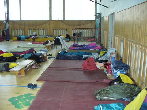 My jsme dostali přidělený nocleh v tělocvičně místního gymnázia.