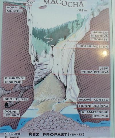 Už v roce 1820 byla vybudována první dřevěná vyhlídka nad propastí. Dnes stojí blízko Horního můstku chata Macocha, která patří KČT, je při ní Útulna z konce 19.století. Obojí prošlo před pár lety rekonstrukcí.