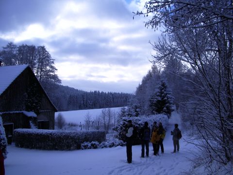 Zpočátku cesty nebylo jiskřivé počasí, ale během dne jsme se dočkali několika zvratů, takže jsme zažili jak kalendářovou modř, mlhavo, tak i sněhové přeháňky laškovné i úderné a samozřejmě taky normální zimní vysočinské počasí (teploty mírně pod nulou). Sněhu bylo právě tolik, abychom se nebořili, ale ne tolik, abychom litovali, že by bylo líp na běžkách.