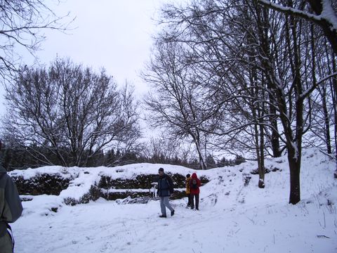 Připili jsme si na tuto i všechny další cesty, nijak jsme se nezdržovali a stále po žluté TZ jsme došli ke zřícenině hradu Ronovec (vznikl ve 13. století, zpustl už v 16. století). Těch žalostných zbytků zdí, které zůstaly na kopci nad Břevnickým potokem, se ujal TOM Káňata. Byl zde proveden archeologický výzkum (nálezy jsou k vidění v blízké Dolní Krupé) a tomíci upravují okolí a snad i zpevňují zbylé zdi. Jako na každém správném hradě, i zde je prý poklad – nezdržovali jsme se jeho hledáním, protože sněhové podmínky by to značně ztěžovaly, ale možná v létě…Dřívější název hradu totiž byl Sommerburg (Letní hrad) a to třeba něco naznačuje…