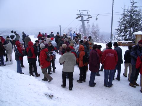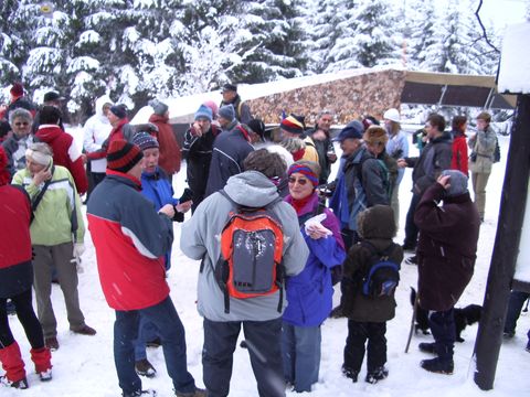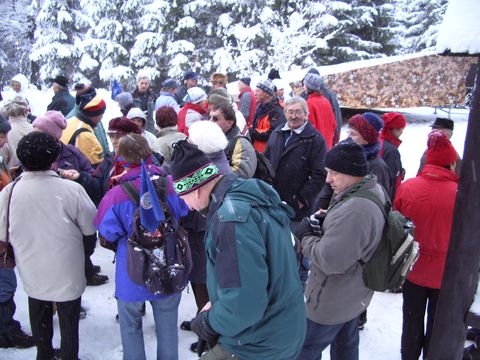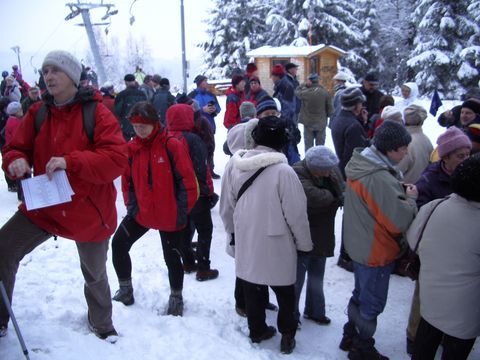 My z odboru Čeřínek jsme se sešli ve 13 hodin před Jitřenkou, pak u rybníka Borovinka jsme udělali zastávku, při které se pronášely zdravice – jednak kvůli Jarce Kratochvílové, která zažívá novoroční narozeniny už po sedmdesátépáté, a pak jsme připíjeli na všechno a pronášeli turistický pozdrav: “ Ať nám to chodí a myslí“ – zatím se tomu smějeme, ale turista nikdy neví…Po modré TZ jsme kolem hájenky došli k Lyžaři a odtud už na Šacberk. Na všech přístupových trasách bylo pořádně rušno, bylo hezky a hodně lidí chtělo první den roku dělat dobré skutky. Potkávali jsme se se známými, krátce popovídali (i připíjeli) a na vrchol Šacberku jsme došli ve velmi dobré náladě a vykonali poslední dobrý skutek – snad naše penízky nevidomým přijdou vhod. Vždycky se těším na setkání na Šacberku, protože je opravdu srdečné a všude panuje dobrá vůle a radost ze setkávání. Kromě čtyřlístku (letos byl v barvě červené) jsme dostali krásný diplom. Nevím, kolik nás bylo, po zjištění počtu účastníků vám to sdělím, zatím nabízím pár fotek, na kterých se třeba najdete, ale hlavně je na nich vidět, že nás přišlo opravdu hodně…