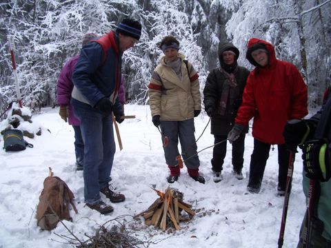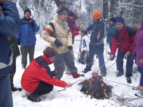 Více o obou chatách se můžete dočíst zde a zde. Vrchol Čeřínku (761 m) je asi 500 m od chat a tam byl náš dnešní cíl. Starosta sokolské župy plk. Švece Ing. Brada rozdělal (při dodržení všech bezpečnostních opatření!) uvítací novoroční oheň, na kterém jsme si docela prozaicky opekli špekáčky…