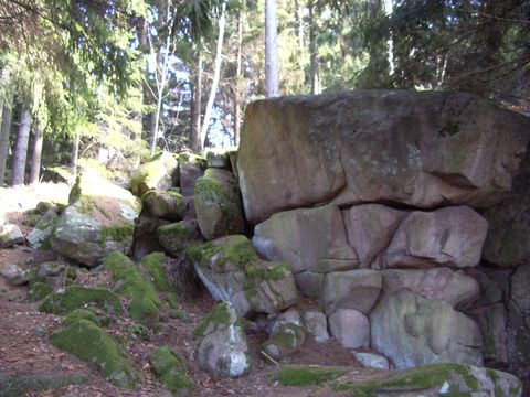Kousek za velkou chatou jsme odbočili z modré vlevo přímo do kopce a k další přírodní památce – ke Skalce. Žulový hřeben v délce asi 600 metrů se překonával v nabídce romantických seskupení balvanů.