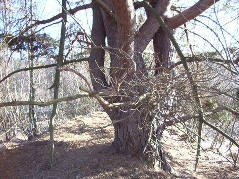 Rašeliniště má rozlohu asi 5 ha a má svoji královnu – je to nádherná borovice. Jako správná panovnice je obklopena strážci, bylo tedy nad naše síly pořídit slušný obrázek. Okolní křoví je téměř neprostupné a sluníčko se taky nedalo přesvědčit, aby změnilo směr, tohle je výsledek: