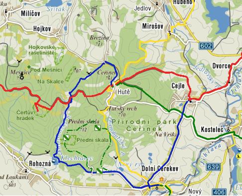 To byl pro dnešek konec poznávání, teď už jenom cesta zpátky. Po silnici od Hojkova jsme došli do Nového Hojkova, po modré TZ pod chatu KČT na Čeřínku a dále 4,5 km dolů po zelené do Kostelce na vlak. Měli jsme to správně vypočítané, asi 5 minut byla rezerva. Odjížděli jsme v 16.50. Ušli jsme asi 24 km, ať nám to příště zase šlape!