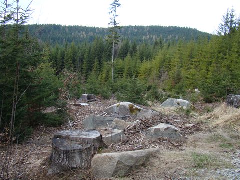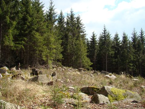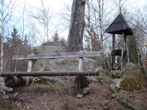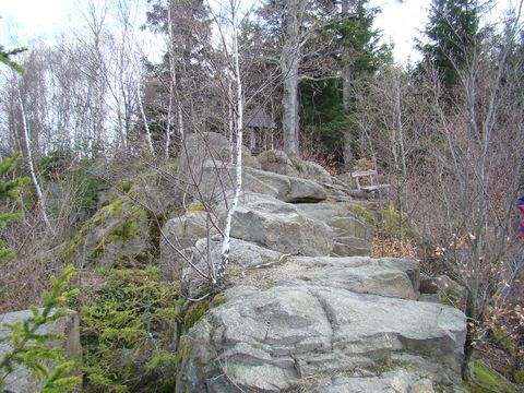 Došli jsme do osady Dolní Hutě a tam jsme se potkali s naší dávnou známou u její chalupy a ona se nám po uvítacích formulích a dotazech zmínila, že prý po otci jejího manžela má snad být pojmenovaná nějaká skála, pan Gilbert prý měl zdejší okolí moc rád, ale ona nic bližšího neví. Rozloučili jsme se s ní, vystoupali jsme k Čertovu hrádku