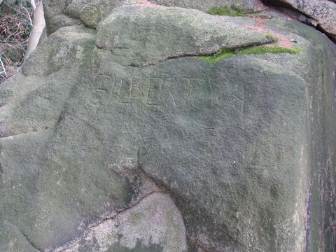 a pak už honem zkontrolovat Skalku, ano i Fialovy skály trčely na svém místě a vypadaly divoce a nepřístupně. Pokračovali jsme po hřebeni dál (fotečky jsou v předchozích příspěvcích) a při obdivování jednoho ze skalních bloků jsme uviděli vytesaný nápis Gilbertova skála… No fakticky, už víckrát jsme se tu zastavili, ale až dneska oko dopadlo… Možná je to věc všeobecně známá, pro nás to byl ovšem objev a novinka a měli jsme ohromnou radost. Na obrázku ukazuje Naše Věra do míst, kde je nápis a na další fotce je detail, který je při troše dobré vůle čitelný.