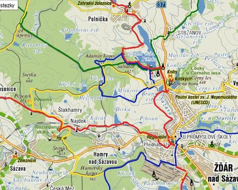 Kudy: Žďár – Hamry n/Sáz. – Rozštípená skála – Peperek – Vápenice – Jordánek – cukrárna – nádraží ČD