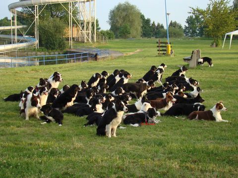 Když jsme se večer vrátili do kempu, bylo tam hodně rušno, sjeli se sem z celé republiky border kolie se svými páníčky, aby se zjistilo, kdo je jednička. Naskytli jsme se u hromadného fota, myslím, že vás tolik psů stejné rasy zaujme: