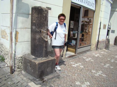 Na zmenšené fotce není vidět, že vzadu s oranžovou výlohou jsou BATOHY . Na náměstí přítomní mužové povzdechli, že se pranýř používal v 17. století, hodil by se prý i teď.