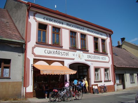 Jeden z místních Erbenů, perníkář, začal na začátku 19. století péci tzv. Miletínské modlitbičky, které tu vyrábějí doposud a jsou nebesky dobré! Zdobené perníky napodobují modlitební knížky a každý většinou po ochutnání procítěně řekne: Bože, je to fakt dobrý!“ V průjezdu slavného domu jsme dostali razítko, v cukrárně nám uvařili výbornou kávu a my jsme rozpoutali perníkovou smršť, starému panu Erbenovi z toho šla hlava kolem…