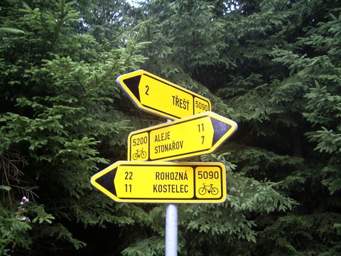 Zpátky jsme sebemrskačsky zvolili cestu do Batelova a pak přes kopec Hanzalku do Třeště – to aby nám život nepřipadal tak jednoduchý. Z proviantního skladu Peugeot jsme si vyzvedli dobroty, zhltli je a vydali se na kontrolu další trasy č. 5200, od třešťského Hranečníku pod Velkým Špičákem přes Stonařov na Aleje, což je 11 km. Značení je zde ve velmi dobrém stavu, jen jsme museli natočit některé značky správným směrem – zlomyslný záškodník je na dvou rozcestích nasměroval jinam, ať ho vezme čert!