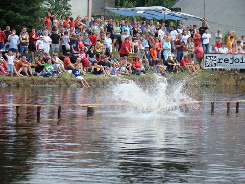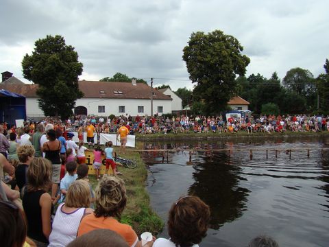Shodli jsme se, že pro tentokrát historie a kultury stačilo a že máme možnost udělat v Růžené rozpustilou tečku za dnešním dnem, což jsme vzápětí začali realizovat. Bylo pozdní odpoledne, když jsme do Růžené dorazili, akce „Lávka“ šla do finiše. Vysvětlím. Na návesním rybníku postavili pořadatelé rafinovaně zprohýbanou úzkou lávku na kůlech a úkolem těch, co jim život není milý, bylo, aby se dostali na druhý břeh (pokud možno rybníka, nikoliv na věčnost). Přesunové prostředky jsou běh prostý, běh s kamarádem sedícím na trakaři, přičemž uprostřed trasy se pozice vymění, a cyklojízda. Stačí jen kousek fantazie, abyste si představili, co všechno tu bylo k vidění…