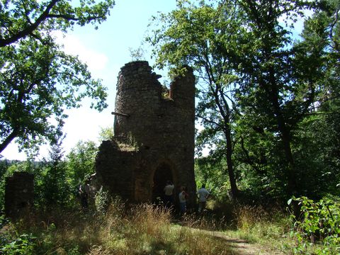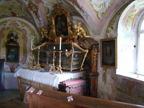 Mladá snaživá průvodkyně se nám věnovala a měla radost z našeho zájmu (ve skupině nás bylo 5!). Ukázala nám kapli, která jediná se zachovala v původním stavu, protože místnost ve věži byla zamčená, vchod byl zarovnán a světec na oltáři to asi vyřídil u Nejvyššího…