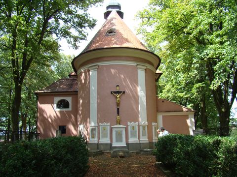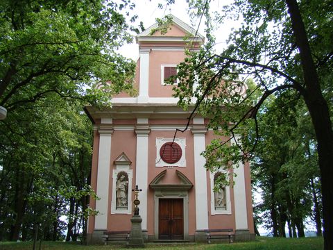 Z věže nám ukázala směrem ke vsi Kostníky, kde je na mírném kopečku zvaném Hájek hřbitov majitelů zámku. Vydali jsme se tam potom a prohlídli si kapli Narození Panny Marie aspoň z venku.