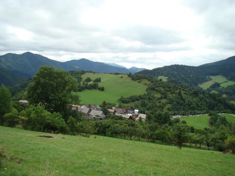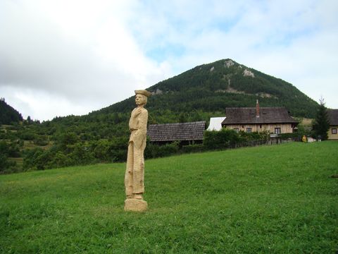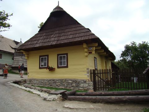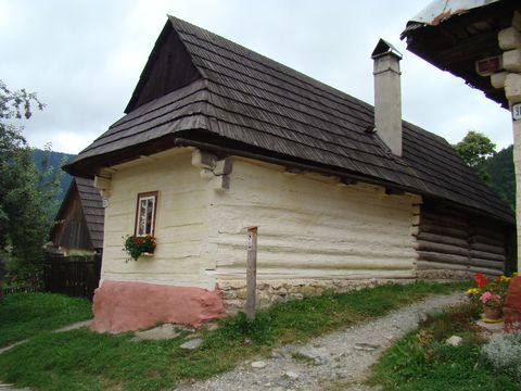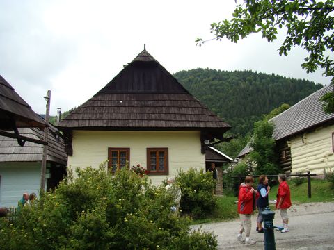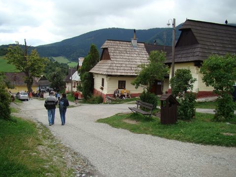 Namlsáni pamětihodnostmi zamířili jsme k další památce UNESCO, do obce Vlkolínec, která leží na svahu kopce Sidorovo v těžko přístupné oblasti (718 m n.m.) nad údolím říčky Revúca (silnička úzká, řidiče autobusu Toníka jsme obdivovali, že nás v pořádku dovezl na parkoviště pod kopcem asi kilometr od obce). Vlkolínec je sice část Ružomberoka, ale pro svoji odlehlost si zachoval středověký ráz, takže je od roku 1993 zapsán na seznamu světového kulturního dědictví.