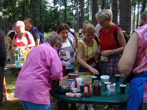 Asi po třech kilometrech jsme došli k rozhledně pod Granátníkem, kde byla nejen kontrola, ale i dojemné setkání se zakladateli tohoto úspěšného pochodu a s turisty, kteří už se nemohou pro různé neduhy vydat na delší cesty. Výstavka fotografií z minulých ročníků pochodu se těšila velké pozornosti, majitelé vzácných obrázků byli na ně patřičně hrdí a rádi odpovídali na naše zelenáčské dotazy a hostili nás při tom domácím cukrovím.