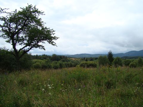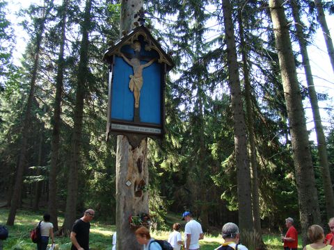 Pořadatelé věnovali velkou péči tomu, abychom prošli ta nejkrásnější a nejzajímavější místa, proto značnou část dnešní (pak i zítřejší) trasy vedli po vlastním značení. Tak nám umožnili i přístup do bývalé vsi Rojov, ze které zbyl jen kříž, pár ovocných stromů a zarůstajících rozvalin. Na jejím katastru se teď prohánělo v oboře stádo daňků… Byli jsme na území přírodního parku Poluška, který si plně zasluhuje své označení. Vystoupali jsme na stejnojmenný vrchol (919 m), tam byla kontrola s razítkem a občerstvení.