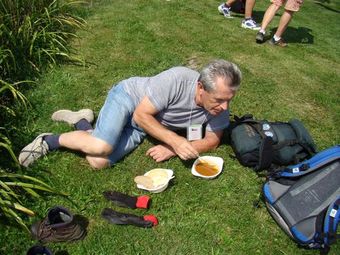 vydali na kamennou Josefskou rozhlednu. Rozhlédli jsme se důkladně a ubírali se dneska už jen převážně dolů, tedy po červené TZ k Uhlířské hájovně. O tom místě se dá mluvit jenom v superlativech, k polévce od pořadatelů jsme si dopřáli nádherný výhled.