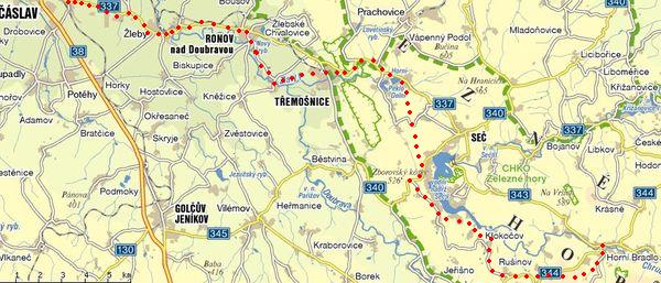 Trasa 1. dne: Čáslav – Ronov nad Doubravou – Třemošnice – Lichnice – Seč – Klokočov – Lipka – Horní Bradlo = 48 km