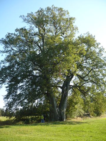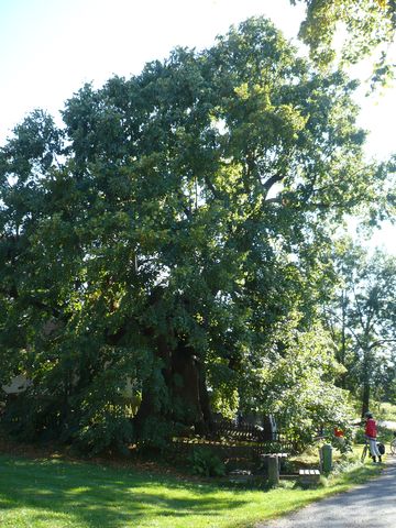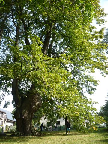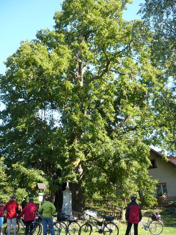 Nad Modletínem jsme se potěšili výhledem do kraje a velmi lehce jsme se všichni shodli na tom, že nemůžeme minout památnou lípu v Lipce, kterou jsme obdivovali už loni. Ano, čekala na nás, vznešeně tu u tvrze stojí už asi 600 let, obvod její koruny je 85 m, výška 27 m, obvod spodního kmene je 802 cm.