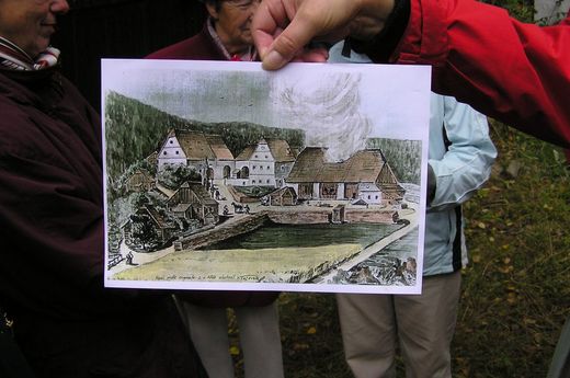 Trampská osada zanikla, komu dnes patří chata "Na Falářce" nevím. Došli jsme k bývalé Bouchnerově sklárně a obdivovali jsme detailní Rudovy vědomosti o jihlavském sklářství (pracoval v oboru). Taky nám ukázal kopii vzácného obrázku zdejší sklářské hutě, který podle originálu z roku 1866 překreslil Václav Tajovský. Jsem nucená nabídnout vám následující fotku, protože se mi bohužel nepodařilo udělat jenom výřez: