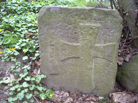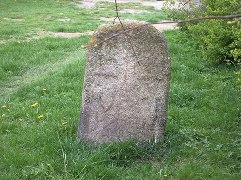 Další kámen je v rohu bývalé zámecké zahrady (zámek byl zbourán roku 1986), kam ho z ovčína nechal před lety přenést majitel panství baron Richlý. Je na něm k přečtení letopočet 1644, nápis Matte-us Lew a u kříže puška hlavní nahoru. Váže se k němu pověst o synovi místního ovčáka, který se po letech vracel z vojny a byl v noci zastřelen otcem, jenž ho považoval za zloděje. Otec pak ze žalu nad svým činem brzy také zemřel.