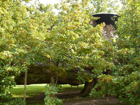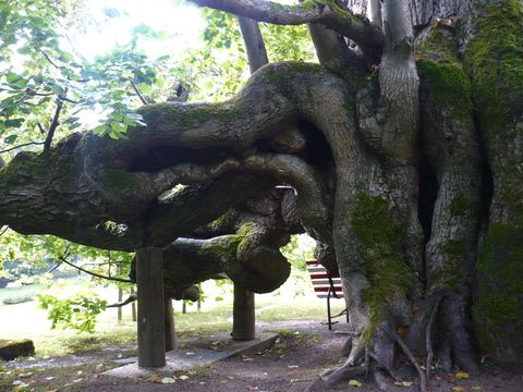 Tak, už o ní něco víme, následuje pár obrázků, ze kterých bohužel nevyzařuje ta síla a kouzlo jako ve skutečnosti. Lípa už nemá hlavní kmen, ale spodní větve s podpěrami dosahují daleko do stran, jsou romanticky členité, porostlé mechem, nejroztodivnějších tvarů, které se mění podle hry slunce a stínu, jistě i podle ročních dob. Můžete u ní strávit hodně času a rozhodně se nenudíte, ale fotit se dá jen těžko – možná, když opadá listí, ale to se dneska naštěstí radostně lesklo ve slunci po právě skončeném dešti…