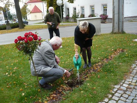 Vedle domu v Kalištích u Humpolce je růžový sad, kam keříky růží zasazují významní návštěvníci – dneska byl zahradníkem Zdeněk Mahler, rodák z Batelova u Jihlavy.
