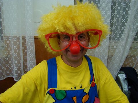 Na závěr jsem si nechala hodně barevnou tečku. Při výukové části jsme probírali i práci s dětmi a mládeží a naši šikovní třebíčští přátelé nám pro inspiraci dovezli ukázat kostýmy, ve kterých letos pořádali veleúspěšnou Pohádkovou Třebíč. Dětí prý tam přišlo skoro 800. A divíte se, když je tam kromě jiných pohádkových bytostí vítal tenhle veselý klaun?